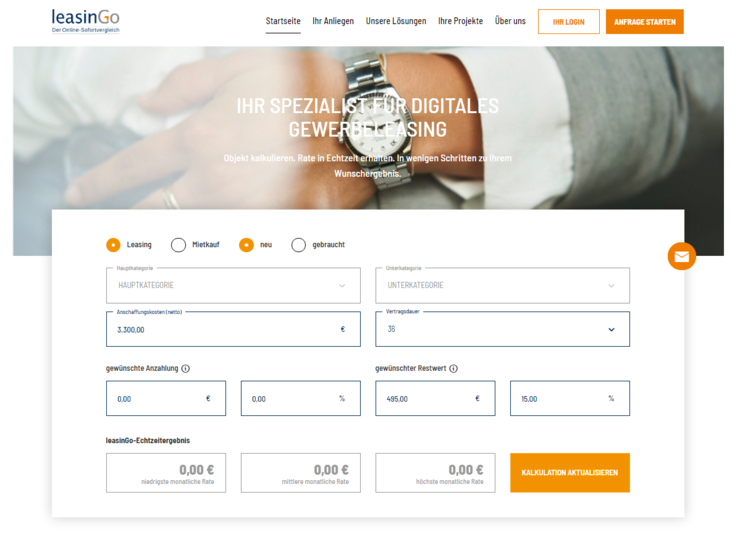 Über leasinGo können Sie jederzeit Leasing- und Mietkaufangebote kalkulieren und Verträge anfordern. Zudem sind unsere Mitarbeiter zu den üblichen Bürozeiten für Sie persönlich per Telefon oder E-Mail erreichbar. Wir begleiten Sie gerne bei Ihrem Investitionsvorhaben!
